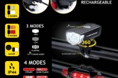Priekšējā un aizmugures luktura ūdensizturīgs (IP44) komplekts ar USB uzlādi. Ātri un ērti uzstādāms, pateicoties vienkāršiem gumijas kronšteiniem, nav nepieciešami papildus instrumenti.