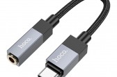 Hoco adapter with a cable from USB-C to Mini Jack 3.5 mm headphone jack. Allows you to connect headphones to your smartphone. A practical solution for devices equipped only with a USB-C port.